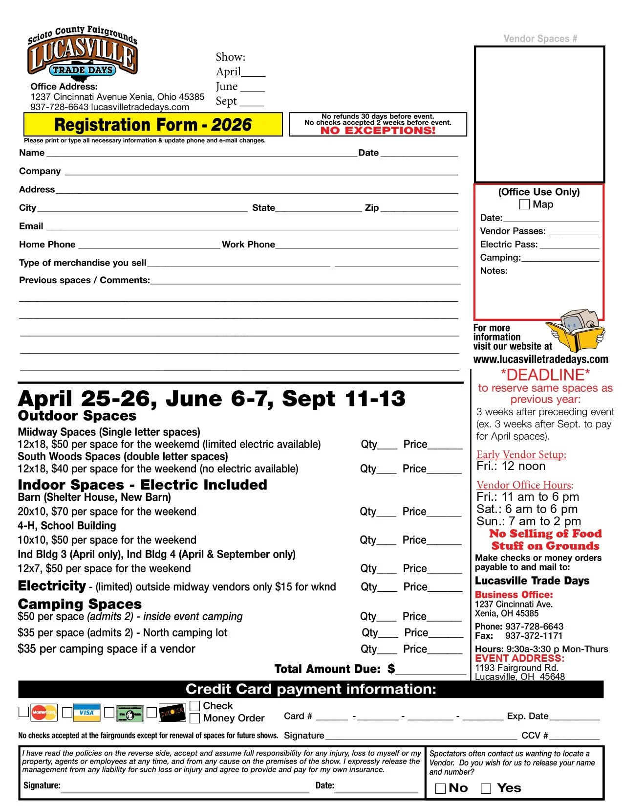 “For 2026: Midway spaces will be $50 (12x18), South Woods spaces will be $40 (12x18), the Shelter House and New Barn spaces will be $70 (20x10) and the 4H Building and the School Building will be $50 (10x10). Buildings 3 & 4 will be $50 (12x7 minimum) The price is per space for the weekend.”